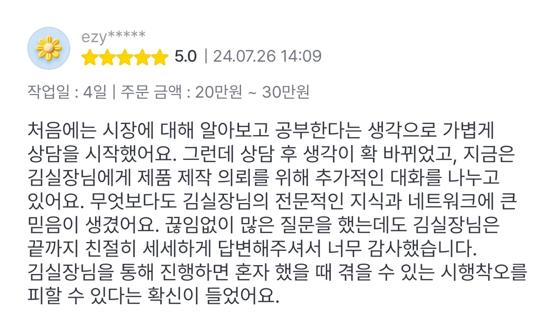 샘플을 먼저 확인하고 결정할 수 있어 부담 없이 시작할 수 있습니다.